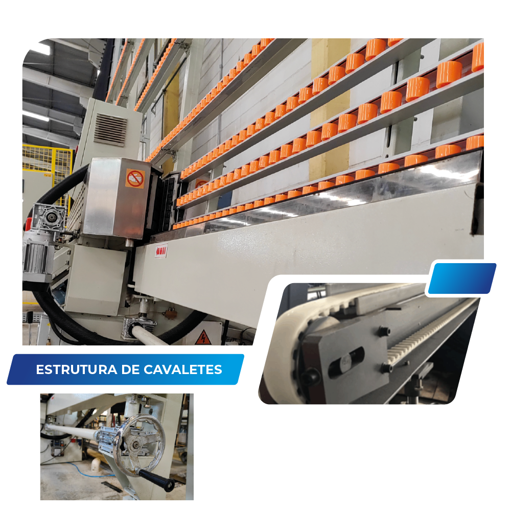A estrutura principal de movimentação dos cavaletes de entrada e saída da máquina é fabricado em perfil dobrado, com lastro (berço) em poliacetal moldado onde as correias, revestidas em AVAFAC (aumenta a resistência à abrasão e durabilidade), correm facilmente, permitindo menor atrito e consequentemente melhor movimentação do conjunto tracionador. As bases dos cavaletes são fabricados em aço carbono e possue regulagem de altura e nivelamento nos cavaletes de entrada e saída, permitindo ajuste de forma simples, prática e rápida. As correias possuem ainda sistema tencionador que permite ajuste fácil e rápido de forma a manter todo sistema funcionando de forma adequada e o conjunto conta ainda com polia de apoio na entrada e saída para melhor e mais segura manipulação dos vidros no carregamento ou descarregamento da máquina.