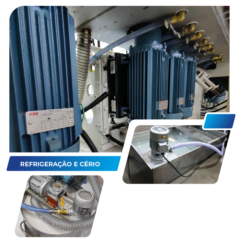 O tanque interno desta máquina é feito em aço inox e de forma bi-partida, ou seja, o compartimento para o rebolo de feltro com cério é isolado dos demais (diamantados, filete e polimento), isso garante maior durabilidade do conjunto e do sistema como um todo. Todas as demais áreas molhada também são em aço inox e devidamente protegidas e isoladas por sistema de vedações de conjunto de escovas especiais, dessa forma, a máquina pode trabalhar sem risco de vazamentos. O sistema de refrigeração conta ainda com tanque de decantação externo também em aço inox e bomba (para os casos de clientes que não tenham sistema interno de tratamento de água). A água decantada do tanque externo, ou do tratamento de água (do cliente) é direcionada, por meio de bomba, ao sistema interno de refrigeração dos rebolos e direcionada por bicos tipo fixoflex para cada rebolo, onde é possível posicionar e ajustar a refrigeração de forma fácil, prática, rápida e eficiente.