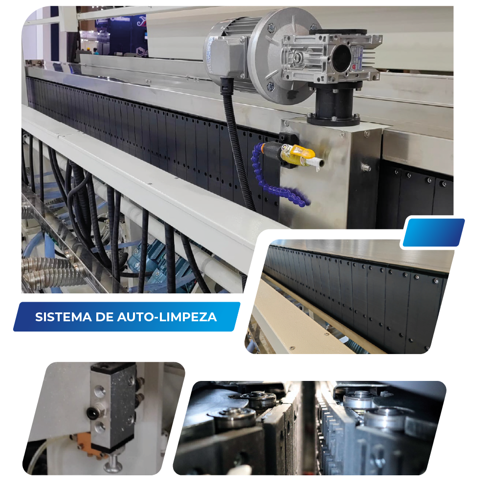 Pensando na durabilidade e eficiência do equipamento e na garantia da qualidade e estabilidade de processamento, esta máquina foi projetada com um adicional importante: um eficiente sistema de auto-limpeza das borrachas nas pinças traseiras garante maior durabilidade das pinças evitando o desgaste e ressecamento gerado pelos resíduos e pó de vidro. Através de uma entrada de água limpa diretamente em um compartimento em aço inox com uma escova ligada à um sistema moto-redutor no conjunto tracionador do bloco posterior (traseiro), as pinças podem ser lavadas. Além disso, na parte frontal da máquina também foi instada uma válvula pneumática onde é possível conectar uma entrada de ar-comprimido de alta pressão, sendo este direcionado por meio de faca-de-ar ao conjunto tracionador traseiro. Desta forma, pode-se acionar este sistema para que o mesmo faça automaticamente a limpeza e secagem do conjunto tracionador, o que aumenta significativamente a durabilidade do equipamento e a eficiência do processo.