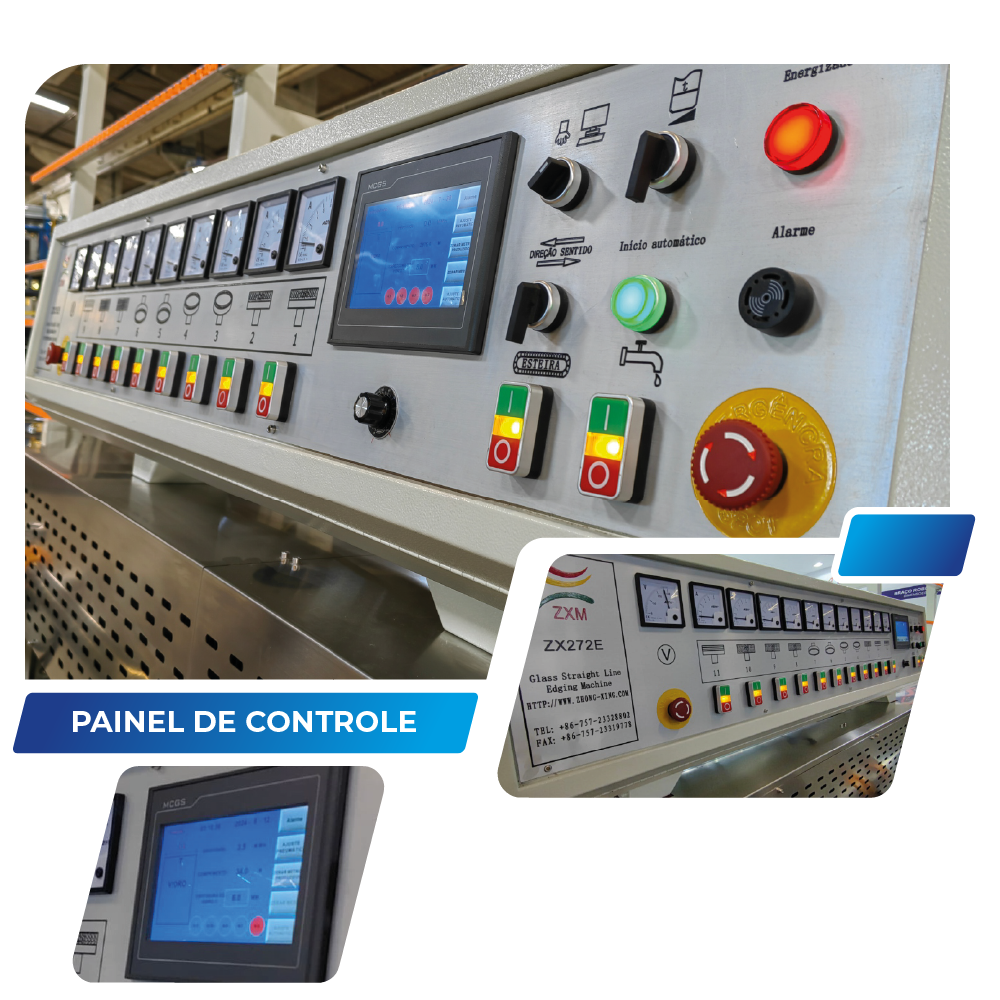 De forma extremamente didática e simples, os comandos deste equipamento podem ser efetuados à partir do IHM (tela touch-screen) da máquina no sistema de gestão de operações e automação no painel principal. A máquina tem inversor de frequência e Instalamos indicadores visuais (amperímetros), botões de regulagem de abertura de bloco, controle de velocidade e direção do movimento da esteira que ajudam no controle manual, enquanto o automaticamente ocorre a compensação de rebolos de polimento (subida e descida automática), sendo ainda opcional este controle de forma manual por meio dos relógios gravitacionais na frente da máquina. O sistema integrado dispõe de uma série de funções que ajudam a melhorar o desempenho do equipamento, como: controle de velocidade/avanço, indicador de espessura errada de trabalho, indicador de posicionamento do vidro em processo, alerta de emergência, contagem de volume de produção diária, etc…
