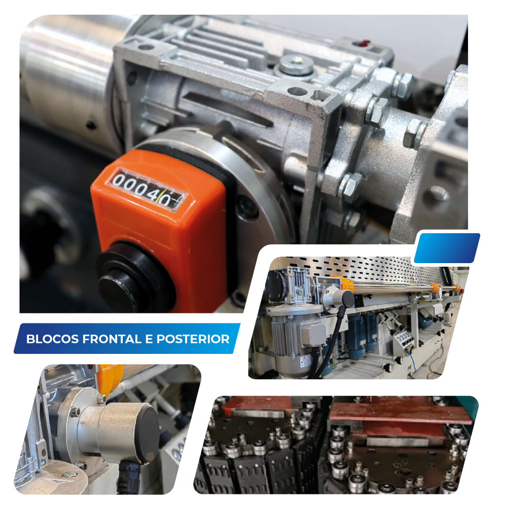Projetados para serem robustos e resistentes, os blocos frontal e posterior do equipamento são fabricados de forma a manter a estabilidade, precisão e eficiência do processo de lapidação. O bloco posterior é fixo na estrutura do corpo da máquina enquanto o bloco frontal é móvel e ligado à um eficiente sistema de movimentação por moto-redutor de alta precisão. O encoder ligado ao sistema, garante a abertura ou fechamento na medida exata exigida pelo operador. Além disso, ainda incluímos um indicador de espessura (lado direito da máquina), de forma a facilitar a visualização do operador ao longo do processo. O bloco frontal, que se movimenta em função da espessura determinada de processamento, têm três pontos de regulagem de tensão e alinhamento do sistema de tração, o que facilita significativamente o trabalho de ajuste, quando necessário, e garante o paralelismo entre os blocos, maior durabilidade e a qualidade da lapidação, principalmente em relação aos rebolos de polimento.