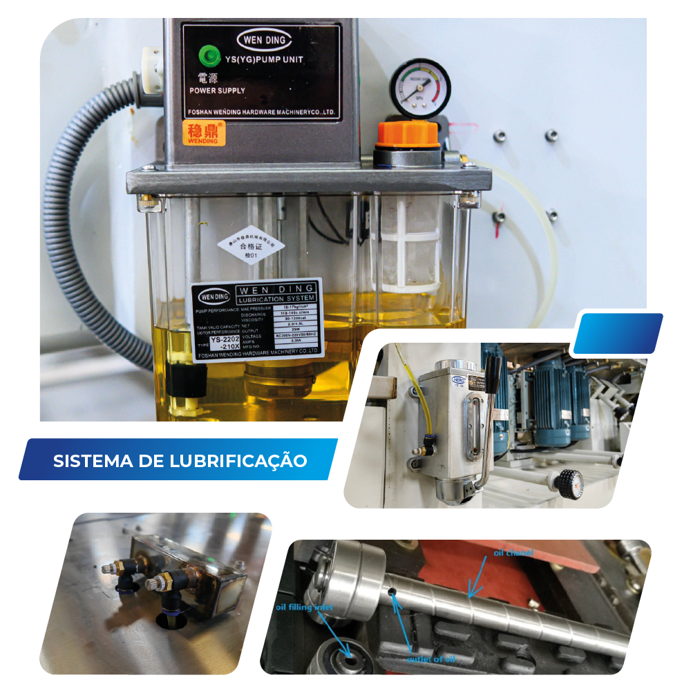 Os rebolos diamantados e resina são de regulagem manual através de relógios gravitacionais na frente da máquina e no cavalete de entrada há regulagem de nivelamento de desbaste (opcional).